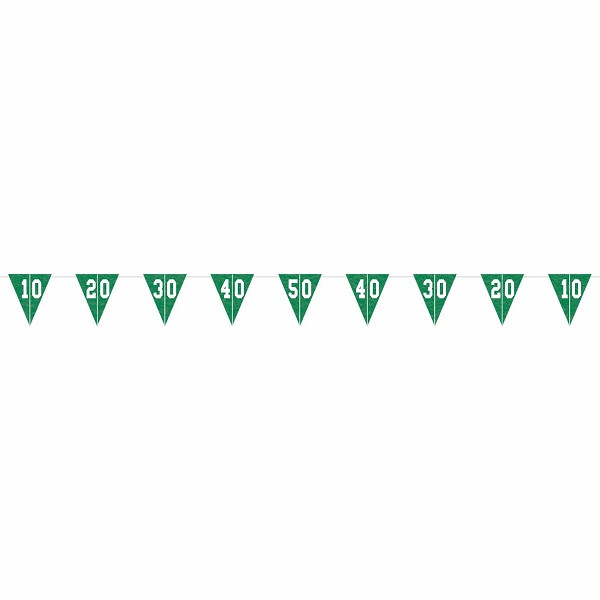 Add a fun touch to your game day party décor with this Felt Football Pennant Banner! This banner features green pennant flags with yard line numbers printed on them in white. Measures 12ft.