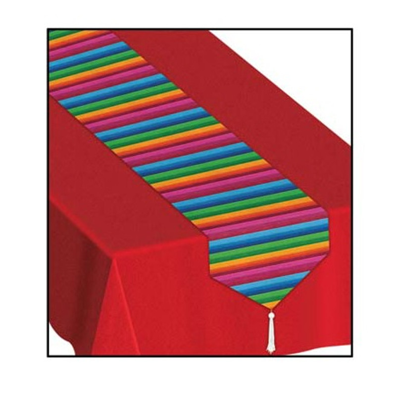 Add a dash of color and traditional Spanish spirit to your table with this Fiesta Printed Table Runner! This paper runner features brightly colored stripes with tassels on each end. Measures 11in x 6ft.