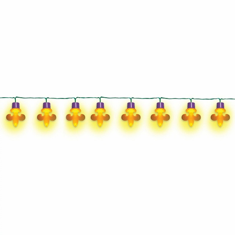 Add some southern charm to your Mardi Gras celebration with these Fleur de Lis Battery Operated String Lights! These battery operated lights feature a soft glow in a Fleur de Lis shape. Lighted length measures 8ft, total length measures 8.5ft.