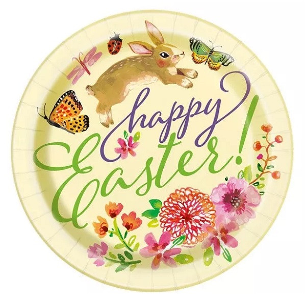 Dish out your springtime supper on these Floral Bunny Dinner Plates! These light yellow paper plates feature a bunny surrounded by springtime flowers, butterflies, dragonflies, and Happy Easter in purple and green letters. Package includes 8 9in plates.