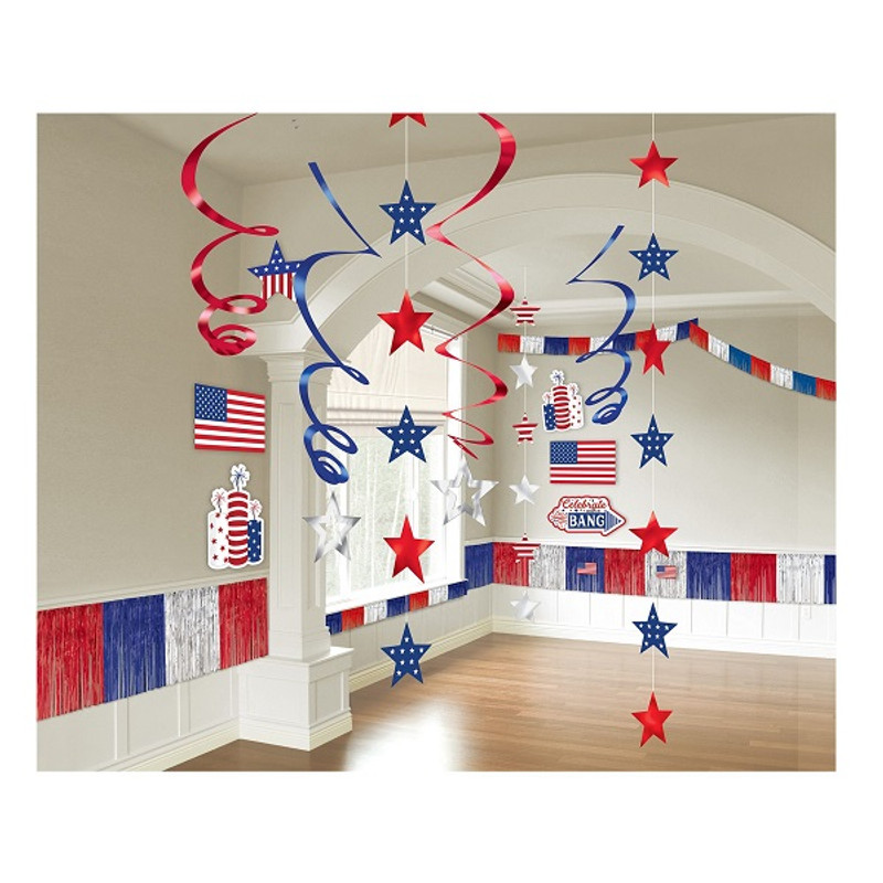 Add some patriotic flair to your 4th of July celebration in a big way with this Giant Patriotic Room Decorating Kit! Package includes 2 36in foil swirls, 2 24in foil swirls, 2 4ft string decorations, 2 3ft foil and paper string decorations, 2 15in paper star cutouts, 2 12in paper flag cutouts, 1 12in paper hat cutout, 1 9in paper cutout, 3 5.75in paper cutouts, 2 10ft x 5in foil garlands, 2 10ft x 15in foil garlands, and 1 50ft string for hanging.