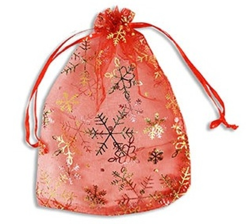 Spread some Christmas holiday joy with a special gift in these Snowflake Drawstring Organza Bags! Available in red or white with matching color ribbons, these organza bags have a pattern of gold foil snowflakes. Desired color not guaranteed. Package includes 5 count bags measuring 5.1in x 7in.