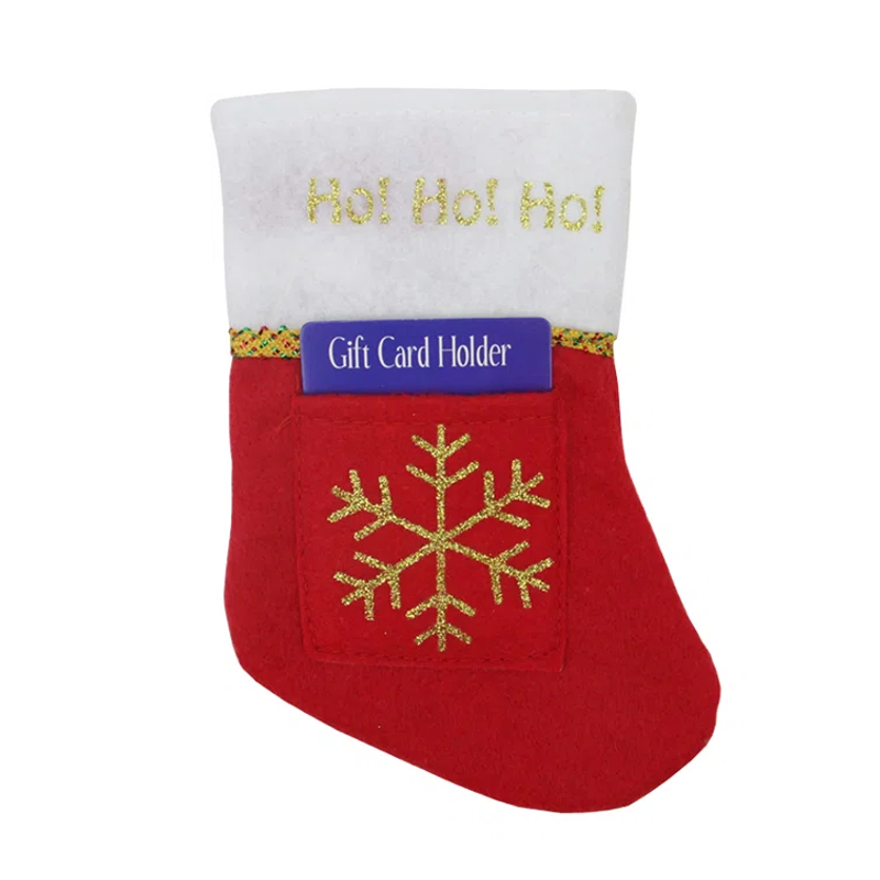 Dress up your offering of a gift card with this Stocking Gift Card Holder. This 7 inch long felt stocking is in classic red and white with a trim of gold and a glitter gold snowflake. On the white cuff there is gold glitter text, available with "Merry Christmas," "Season's Greetings," and "Ho! Ho! Ho!" Holder can fit a standard gift card.