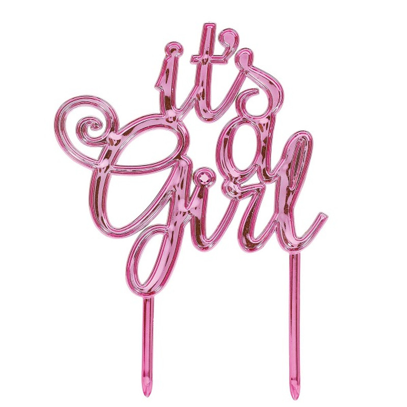 Add some sweet style to your baby shower cake with this Girl Baby Shower Cake Topper! This plastic topper features Its A Girl in a metallic pink finish. Measures 5.25in x 4in.