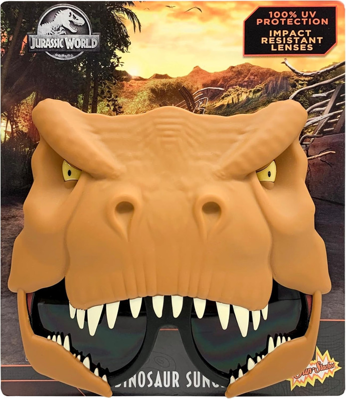 These Jurassic World Sun Staches Glasses are perfect for a dinosaur themed party. These black lenses with black and brown frames appear to be in the jaws of a brown T Rex with yellow eyes. Featuring 100% UV400 protection and impact-resistant lenses, they’re built to keep your eyes safe while you enjoy the sunshine. One size fits most.
