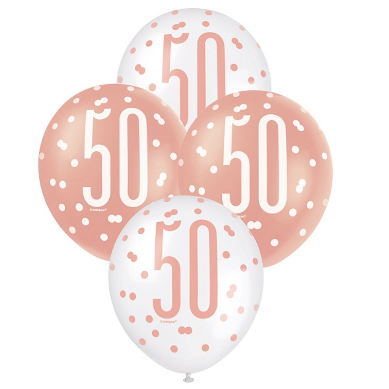 Dress up your 50th birthday celebration with these Glitz Rose Gold 50th Birthday Latex Balloons! These white and rose gold latex balloons feature the number 50 printed on them surrounded by rose gold and white dots. Package includes 6 count,12 inch balloons.