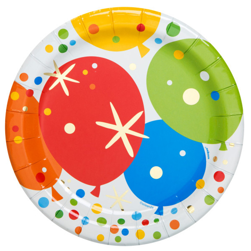 Serve your party treats and appetizers with vibrant style when you use these Glitzy Gold Birthday Dessert Plates! These small, white paper plates feature colorful balloons, dots, and golden starbursts. Package includes 8 - 7in plates. Not for microwave use
