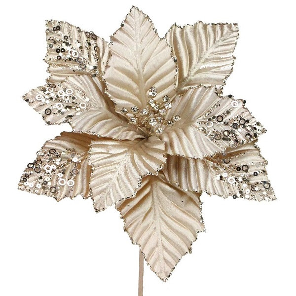 Add some shimmering elegance to your Christmas wreaths and centerpieces with this Gold Glitter Poinsettia Stem! This decorative stem features a metallic gold poinsettia design with glittery leaf accents. Measures 11in.
