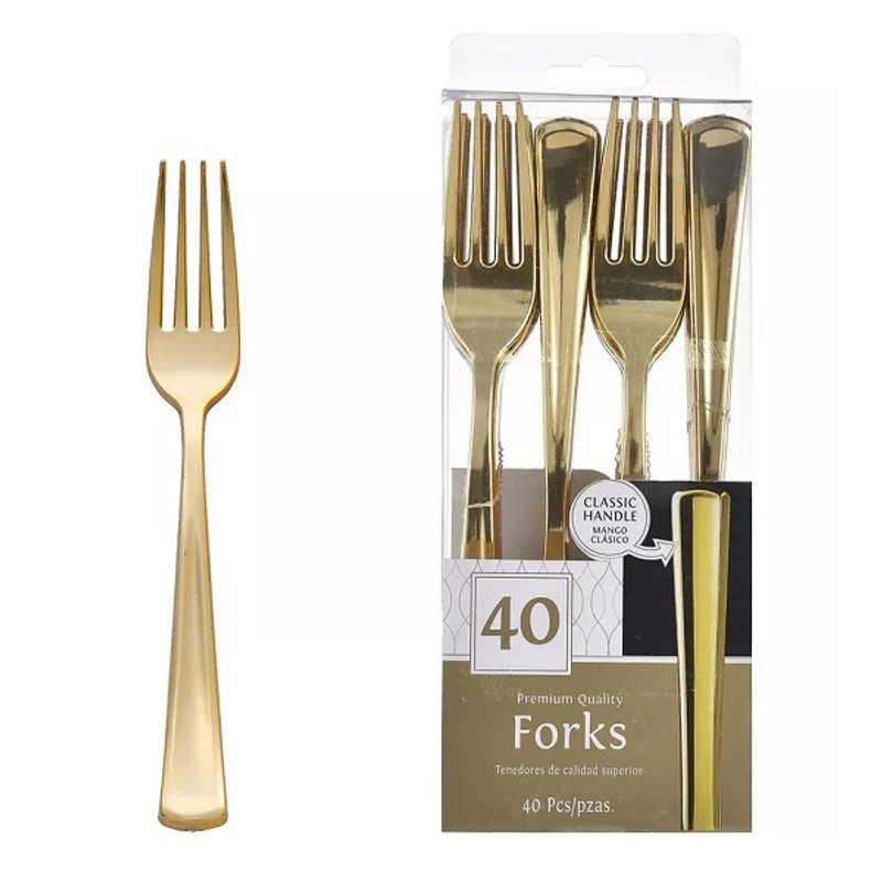 Enjoy your special event salads, pastas, and more with these Gold Premium Plastic Forks! These sturdy plastic forks feature a shiny gold finish. Package includes 40 7in forks.