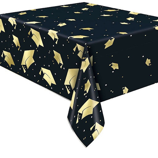 Set the stage for celebration with this Starry Graduation Plastic Tablecover. Featuring a black background adorned with gold graduation caps, tiny white stars, and gold and silver confetti dots, this rectangular tablecover adds the perfect mix of sparkle and sophistication to your grad party setup. Measures 54in x 84in.