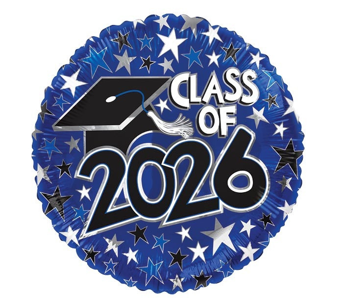 Show your school spirit with the Blue Class of 2026 Balloon! Featuring a blue background with a pattern of blue, silver, black, and white stars, this circular balloon features "CLASS OF 2026" in black and white text, accented with a black grad cap with a white tassel. Balloon is approximately 17 inches after inflation.