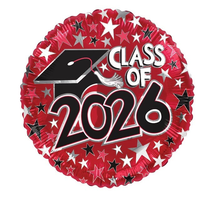 Show your school spirit with the Red Class of 2026 Balloon! Featuring a red background with a pattern of red, silver, black, and white stars, this circular balloon features "CLASS OF 2026" in black and white text, accented with a black grad cap with a white tassel. Balloon is approximately 17 inches after inflation.