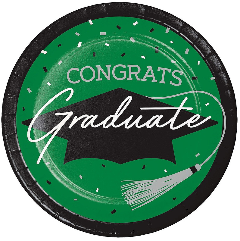 Celebrate your graduate in style with these Green Grad Luncheon Plates! Featuring a green background with a black trim, these paper plates are decorated with black, grey, and white confetti. "CONGRATS" is in grey letters while "Graduate" is in white script over a black graduation cap silhouette with grey tassel. Package includes 18 count 8.75in plates.