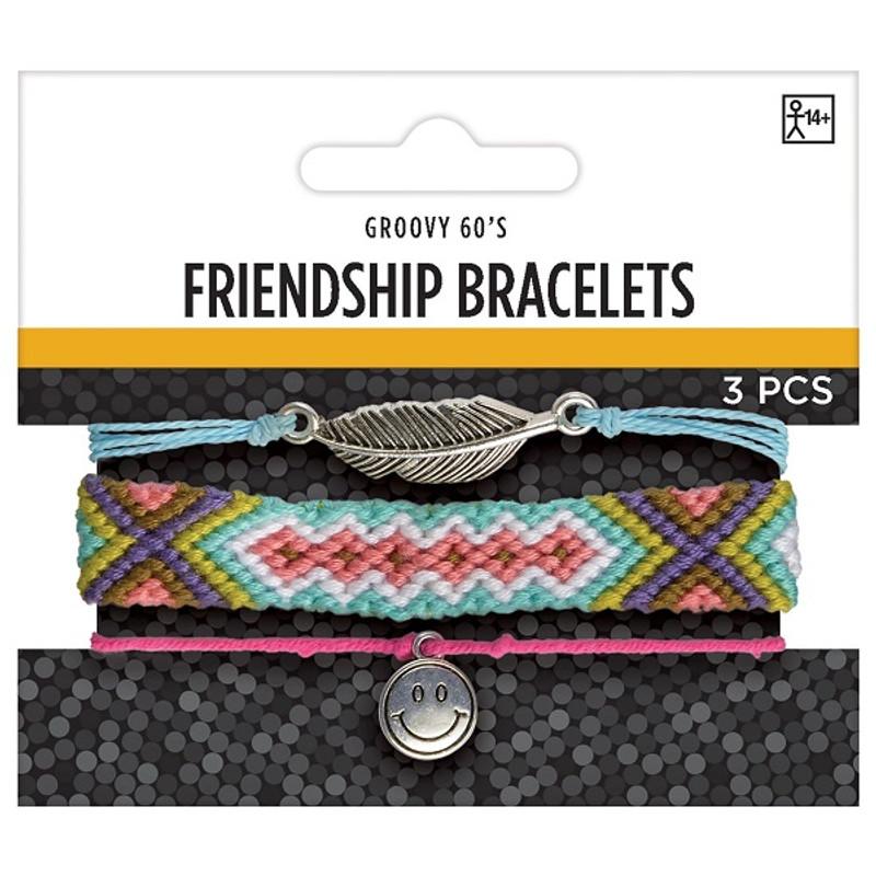 Add more color and style to your hippie costume with these Groovy 60s Friendship Bracelets! These colorful bracelets feature a feather, smiley face, and beaded styles. Package includes 3 bracelets. One size fits most.