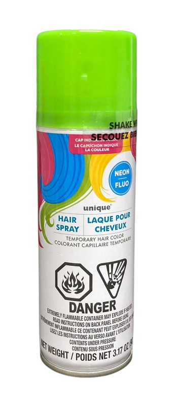 Add a pop of color to your hair with our Solid Color Neon Hair Spray! This spray is great for creating fun, temporary looks. Package includes one can of hair spray. Net WT 4.5oz.