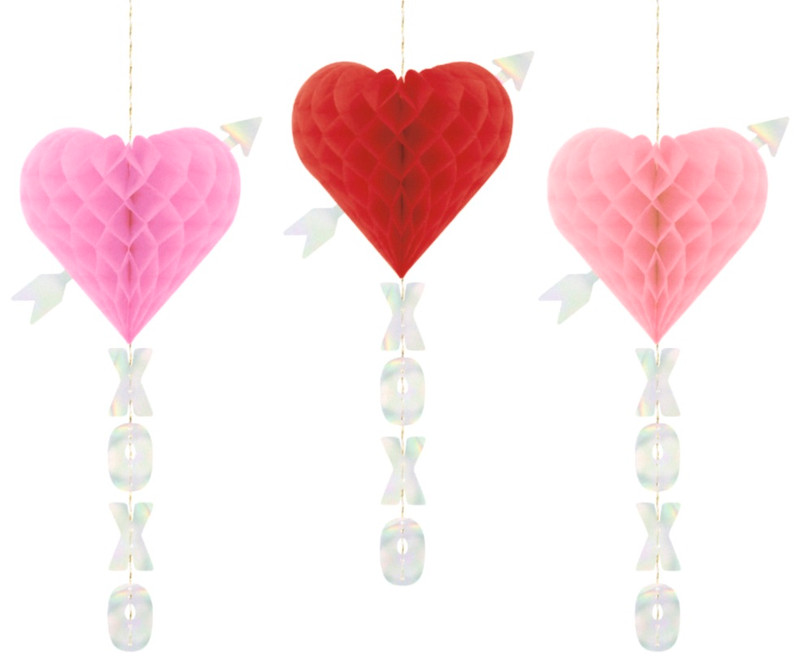 Add some vibrant color to your Valentine's Day decorations with these Honeycomb Heart Hanging Decorations! These light pink, hot pink, and red honeycomb hearts feature iridescent foil arrows and tails with the letters "XOXO." Package includes 3 count decorations measuring 18in.