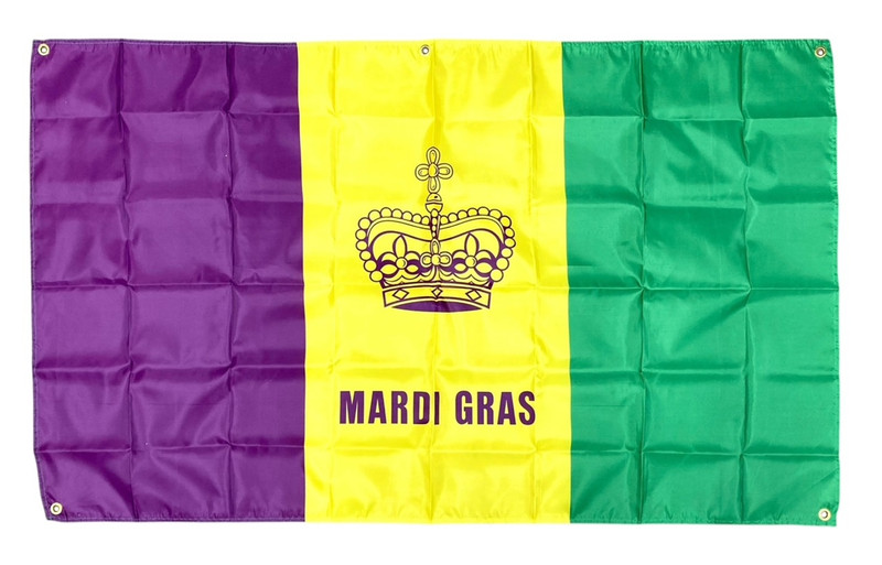 Show your festive spirit with this Mardi Gras Flag. This fabric flag has large purple, gold, and green panels, with a purple crown over the text "MARDI GRAS" over the gold panel in the middle. Measures 3ft x 5ft.