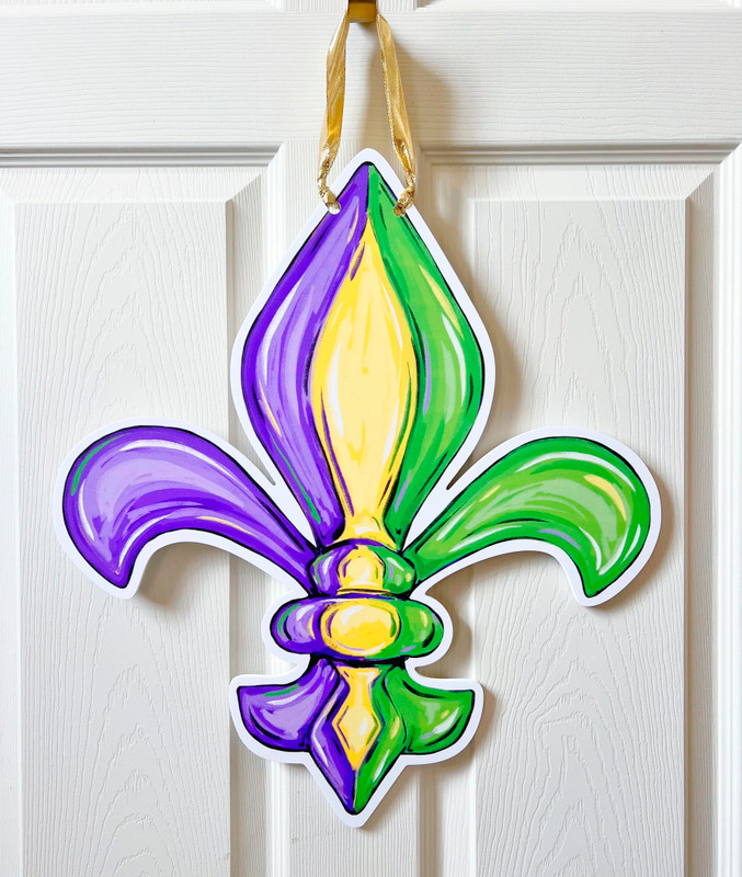 Show your love for carnival season with this Mardi Gras Fleur de Lis Door Hanger. Featuring a printed painterly illustration of a fleur de lis shape in purple, green, and gold, this design is printed on a white PVC sign, waterproof and perfect for indoor or outdoor use. A gold ribbon handle adds a festive touch. Measures 20in x 18in without ribbon, .25in thick material.
