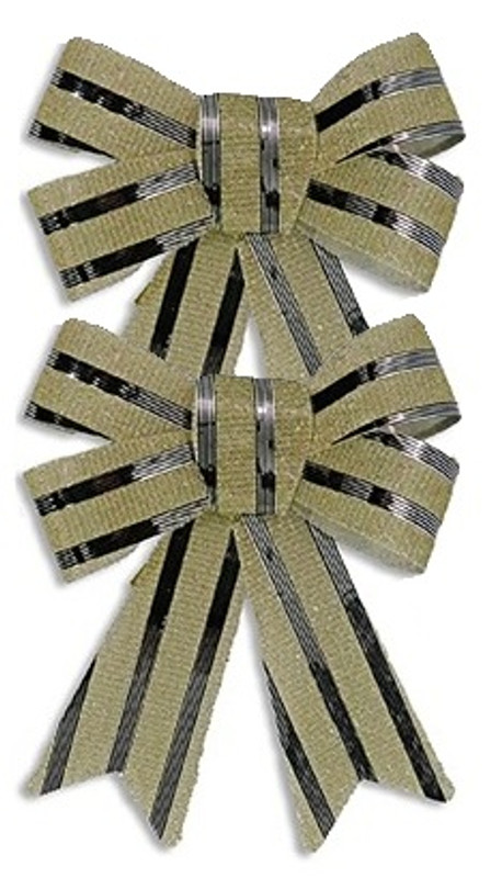Dress up wreaths, hangers, bouquets and more with these Metallic Stripe PVC Bows. Available in red, gold, or silver, these plastic bows feature glittery tinsel with silver and black metallic stripes. Desired color not guaranteed. Package includes 2 count bows measuring 5in x 7.5in.