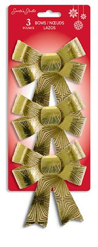 This Shiny Jacquard PVC Bows 3-Pack features 5" x 4" bows in gold, red, or silver. Made from durable PVC with a shiny finish, they're perfect for adding a bit of shine to your holiday decor.