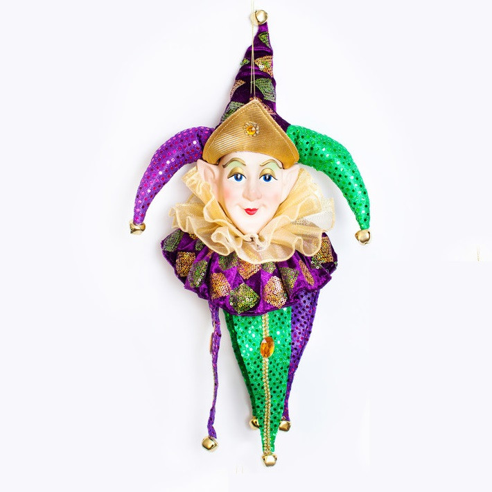 Add some classic Mardi Gras style to your wreaths and trees with this Hanging Jester Head Ornament! Features a painted jester head with hat, ruffled collar, and jingle bells. Measures 16in.