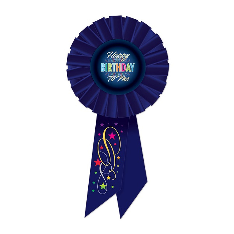 Wear this Happy Birthday To Me Rosette on your special day! This blue satin ribbon features a rosette with Happy Birthday To Me in colorful letters and stars on the tail. Measures 3.25in x 6.5in.