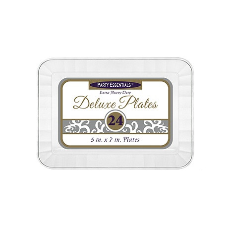 Enjoy your tastiest appetizers served on these Clear Deluxe Plastic Appetizer Plates! These small, premium heavy weight plates have a rounded rectangular shape and decorative edge, perfect for party snacks and desserts too! Package includes 24 count plates measuring 5in x 7in.