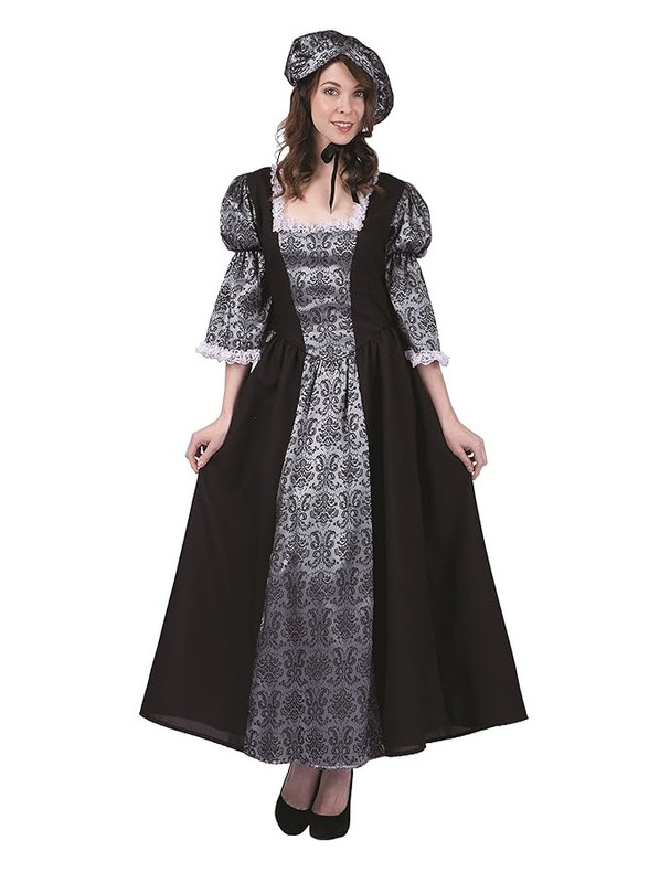 Step into the past with this Adult Colonial Lady Charlotte costume. Featuring a black and metallic silver polyester dress with a damask pattern and white lace, this costume has a zipper closure and an elastic waist. A matching bonnet with black ribbon ties completes the look. Sizes available in small (2 -4), Medium (6 - 8), and Large (8 - 10).