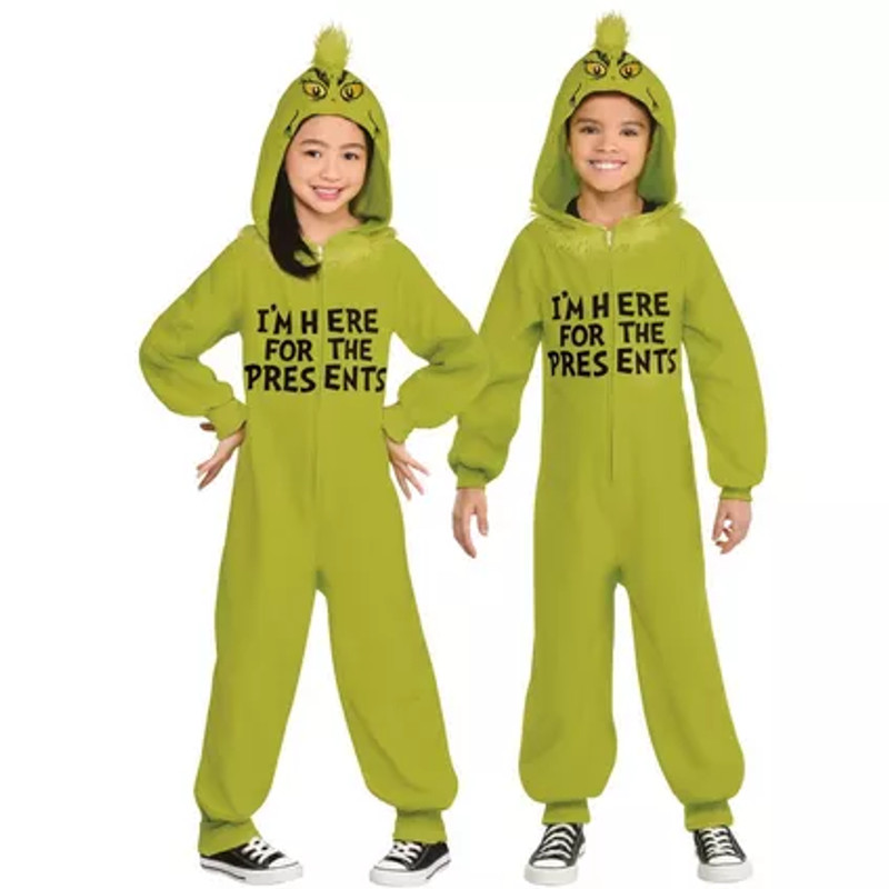 Let your little one embrace their inner Grinch with our adorable Child Grinch Zipster! This green onesie features a convenient front zipper and a cozy hood adorned with the Grinch’s iconic yellow eyes. The playful text on the front reads, "I'm Here for the Presents," adding a fun twist to this festive outfit. Made from soft polyester, this zipster is perfect for holiday parties, trick-or-treating, or just spreading some seasonal cheer.