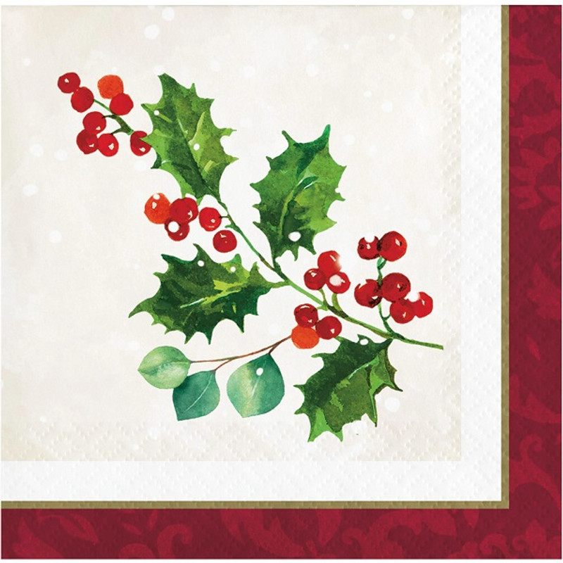 Complement your Christmas party drinks with these Holiday Holly Beverage Napkins! These small white, 3-ply paper napkins feature sprigs of holly with green borders. Package includes 16 5in x 5in napkins.