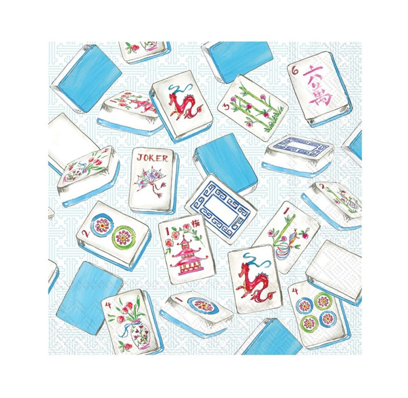 These Mahjong Beverage Napkins are perfect for game night. These small, 3 ply paper napkins feature a white and very light blue patterned background with a scattering of several Mahjong tiles. Package includes 20 count napkins measuring 5in when folded.