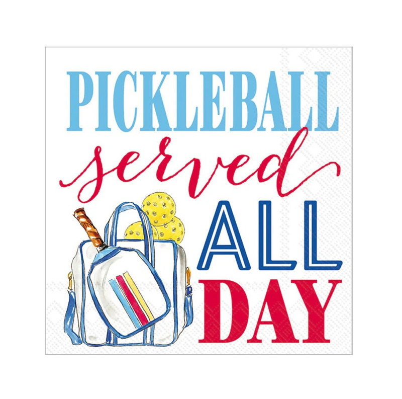 Add a little humor to your Pickleball themed get together with these Pickleball Served Beverage Napkins. These small, white, 3 ply paper napkins feature "PICKLEBALL" in light blue text over "served" in red script. "ALL DAY" in navy blue and red text sits beside a bag of pickleball equipment, including a racket and pickleballs. Package includes 20 count napkins measuring 5in when folded.