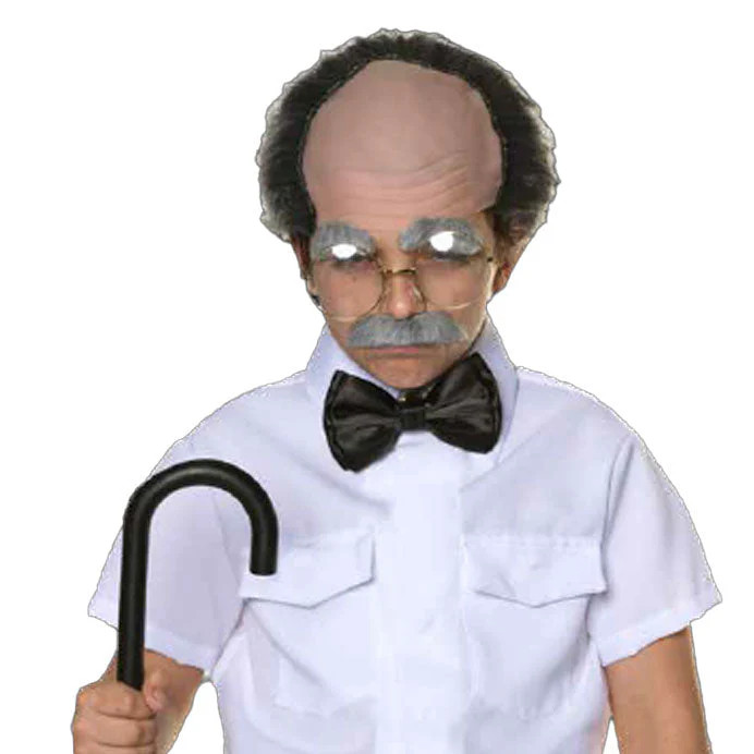 Transform into a charming old-timer with this Old Man Accessory Kit! It includes a grey wig with balding forehead, glasses, a stylish black bow tie, bushy gray eyebrows with matching mustache, and a black cane. Perfect for costumes or parties, this kit adds a fun touch to any dress-up occasion!