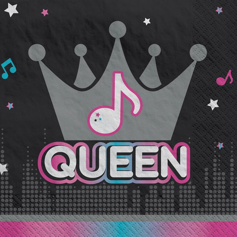 Complement your Tik Tok party drinks with these Internet Famous Beverage Napkins! These small, black paper napkins feature a crown with a musical note and Queen in white letters against a colorful background. Package includes 16 5in x 5in napkins.