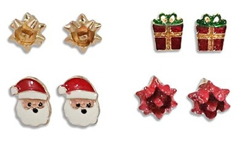 Complete your festive look with these Christmas Stud Earrings. These metal earrings are available in two sets. One set has the shapes of presents, gold gift wrap bows, red gift wrap bows, and Santa faces. The other set has candy canes, wreaths, snow covered houses, and gnomes. Package includes 4 pairs of earrings measuring about .3in. Desired set not guaranteed.