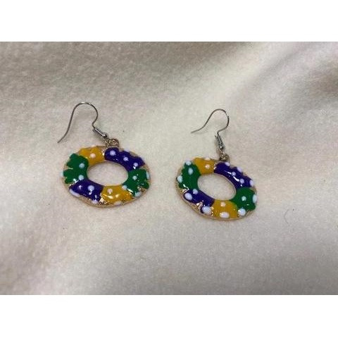 Wear a sweet Mardi Gras treat on your ears with these King Cake Earrings! These goldtone, fish hook pierced earrings features enameled green, purple, and yellow king cakes with white accents. Package includes 1 pair of 1.75in earrings.