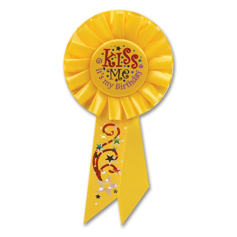 Let everyone give you a birthday kiss when you wear this Kiss Me it's My Birthday Rosette! This sunshine yellow satin ribbon features a rosette with Kiss Me its My Birthday in colorful letters. Measures 3.25in x 6.5in.