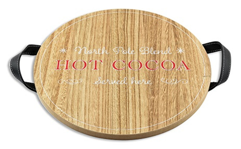 Serve up some holiday warmth with this Round Wood Grain Hot Cocoa Serving Tray! Measuring 11.75 inches in diameter, this tray features a rustic wood grain design paired with black leather handles. The festive text, "North Pole Blend HOT COCOA Served Here," is printed in red and white, adding to the seasonal charm. Perfect for serving hot cocoa, treats, or as a decorative accent, this tray brings cozy holiday vibes to any home.