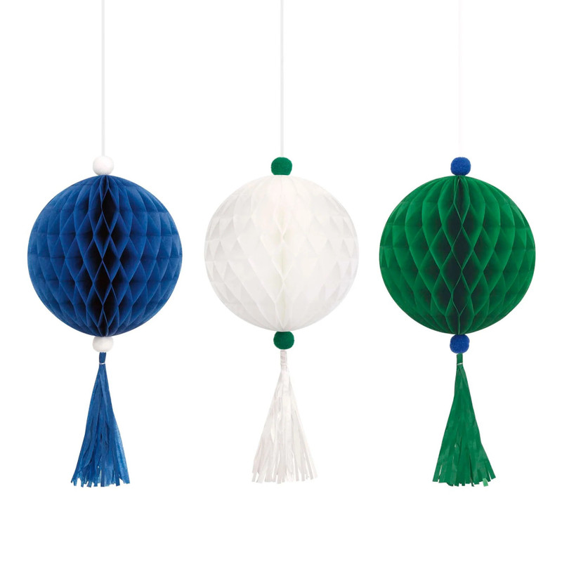 Brighten up your gamer birthday party with these Honeycomb Tissue Ball Decorations! In blue, white, and green, each ball features playful tassels, perfect for hanging or as centerpieces. Package includes 3 decorations, measuring 16in.