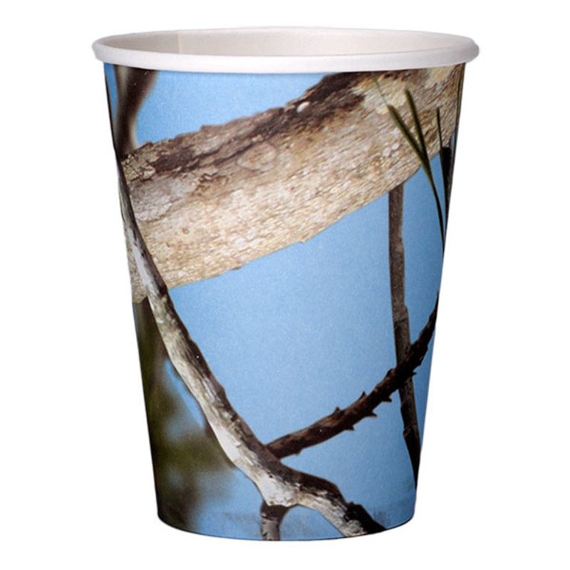 Celebrate your little hunter's big day with these Light Blue Camo Cups! These paper cups feature pine tree branches, leaves, and sprigs of pine needles against a sky blue background. Package includes 8 – 12oz cups.