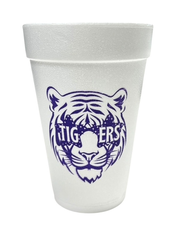 Get into the gameday spirit with these white Styrofoam Cups, featuring a tiger head in purple wearing star shaped glasses with the text "TIG ERS". Each sleeve includes 25 durable cups, perfect for hot or cold drinks at your tailgate. Add a touch of team spirit with these must-have cups. Available in 16oz and 20oz