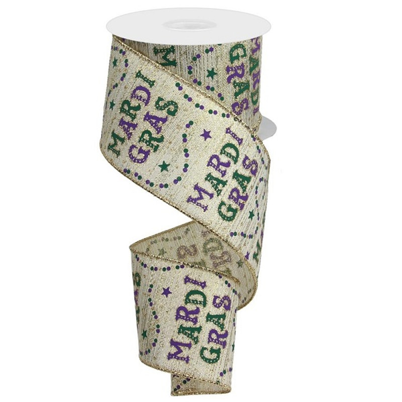 Create a classic look for your Fat Tuesday wreaths and more with this Mardi Gras Beads Ribbon! This light gold metallic ribbon features Mardi Gras in purple and green letters with metallic gold borders. Measures 2.5in x 10yds.