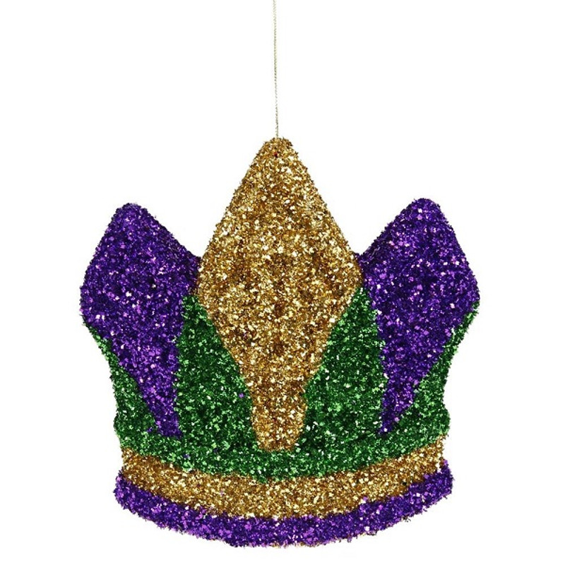 This Mardi Gras Crown Decoration is perfect for displaying in windows, on parade floats, and more! This foam crown decoration features a shimmering green, gold, and green tinsel design with an attached gold hanging loop. Measures 9in.