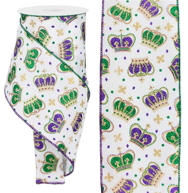 Add some royal sparkle to your wreaths and decorating projects with this Mardi Gras Crowns Ribbon! This white ribbon features gold crowns with purple and green glitter accents, purple and green borders. Measures 4in x 10yds.