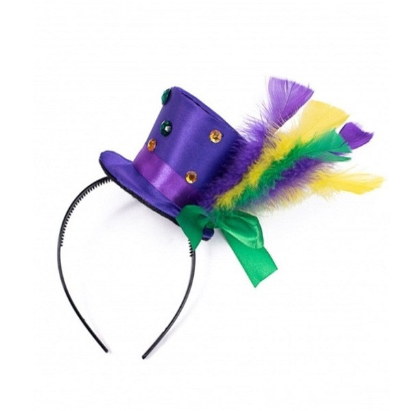 Give yourself a fun and fresh look with this Mardi Gras Hat Headband! This black plastic headband features a purple mini top hat with a green bow, jewel and feather accents. One size fits most adults and older teens.
