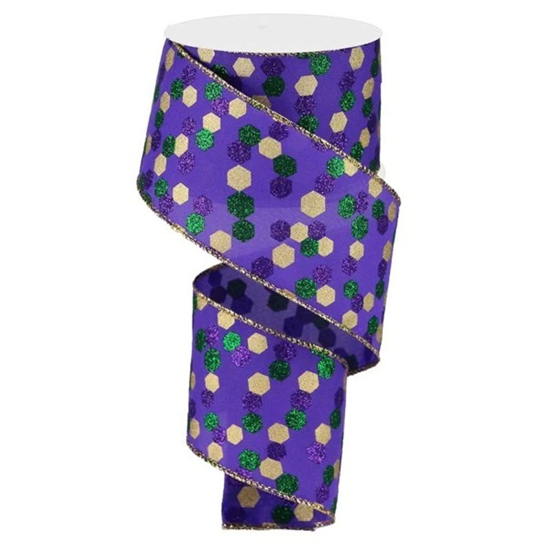 Add a stylish look to your decorative bows and wreaths with this Mardi Gras Pattern Ribbon! This purple ribbon features gold hexagons with green and purple glitter hexagons and metallic gold borders. Measures 2.5in x 10yds.