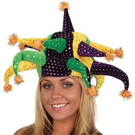 Add some silly shine to your look with this Mardi Gras Jester Hat! This jester hat features green, golden yellow, and purple sections with attached dangling metallic gold pom poms. One size fits most.