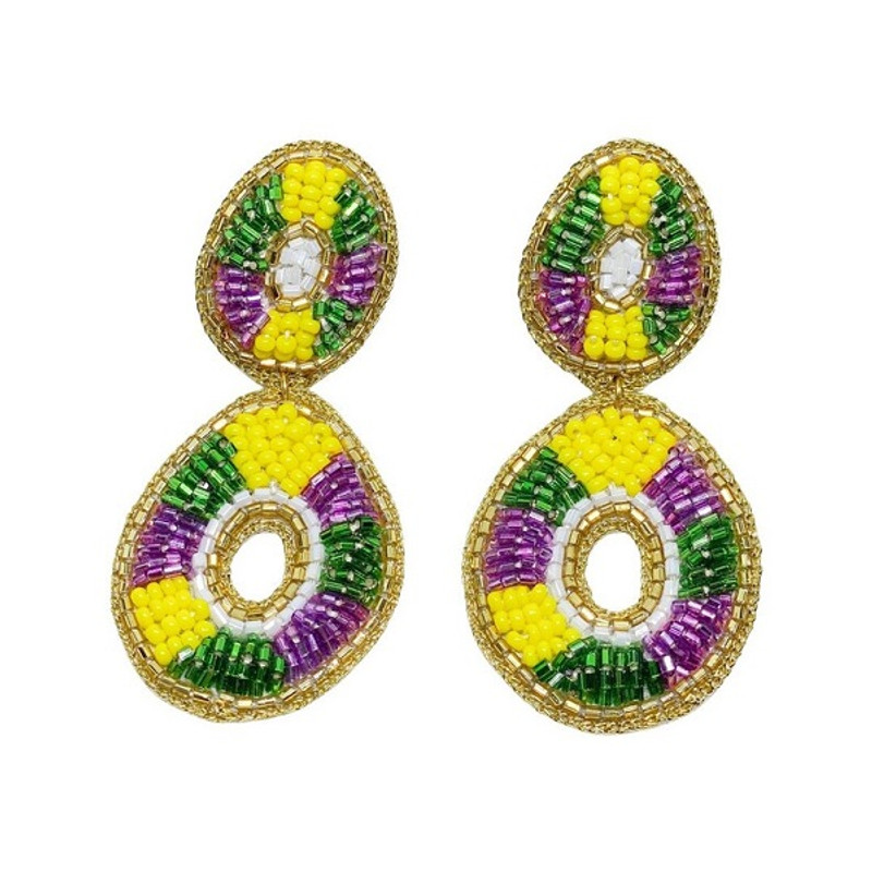 Add some southern flavor to your look with these Mardi Gras King Cake Beaded Earrings! These pierced, felt earrings feature a purple, green, and gold beaded king cake design. Package includes 1 pair of 2.25in earrings.