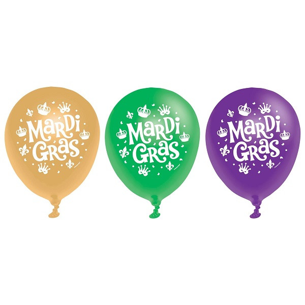 Give your Fat Tuesday celebration some lively color with these Mardi Gras Latex Balloons! These green, purple, and golden yellow latex balloons feature "Mardi Gras" printed in white letters. Package includes 15 - 12in balloons.