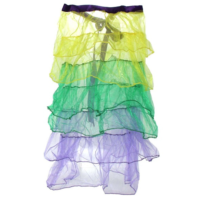 Shimmy and shimmer with this Mardi Gras Lightweight Bustle! This wraparound waist accessory features ruffled layers of green, golden yellow, and green tulle. Measures 36in long. One size fits most.